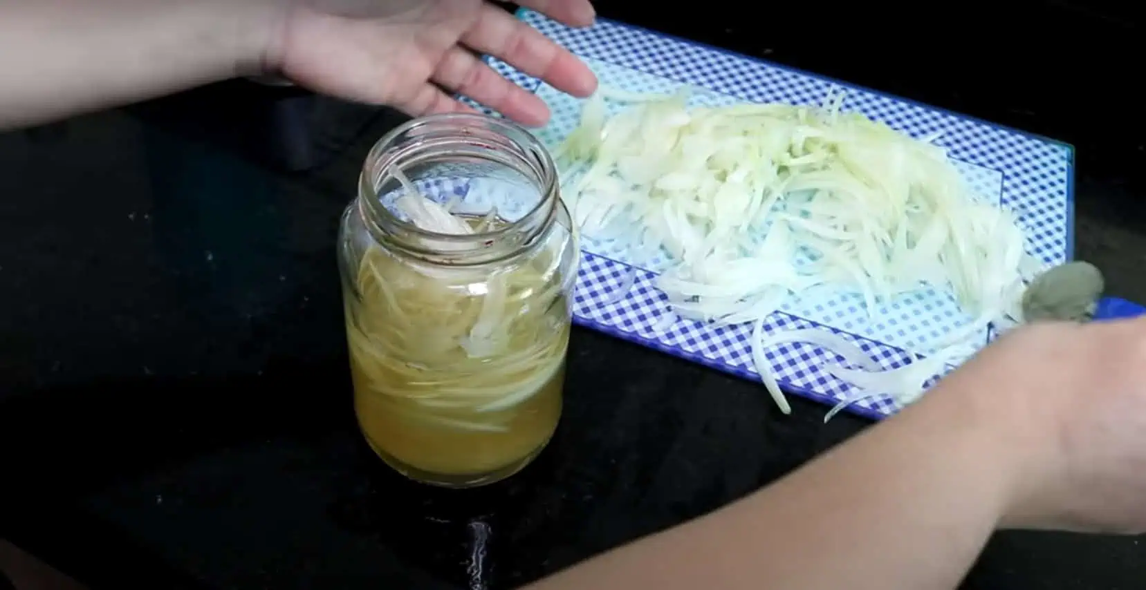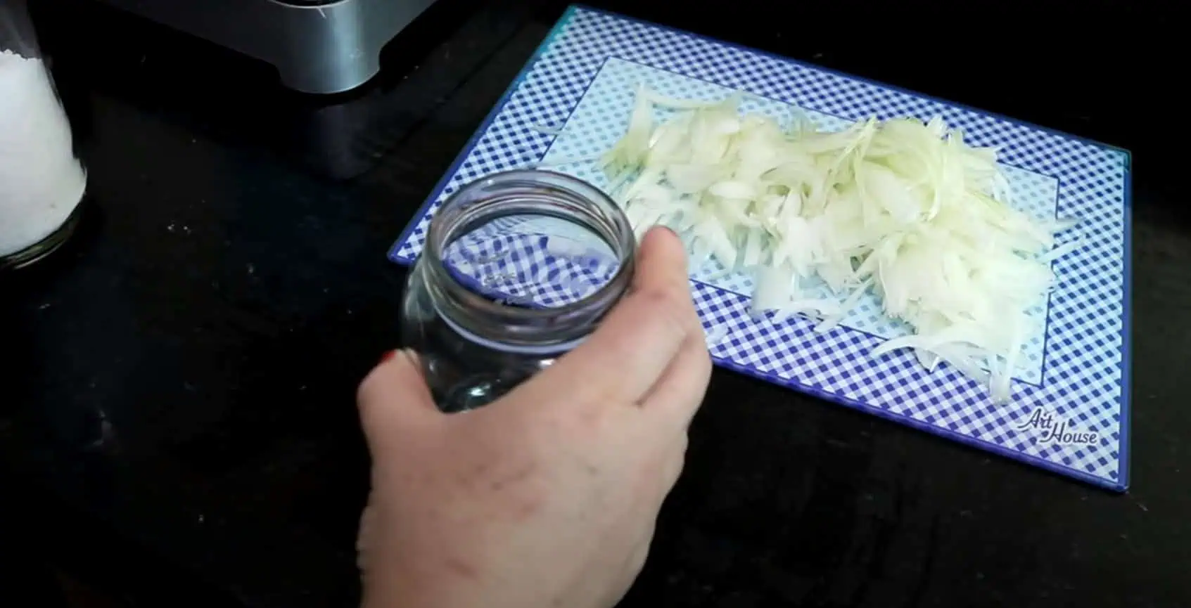 Cibuľu si ošúpeme a nakrájame na veľmi jemné prúžky. Pripravíme si sterilizovaný pohár a všetky ostatné ingrediencie.