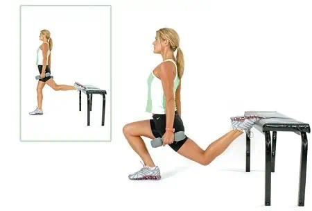 Jednou nohou urobte výpad vpred a druhú nohu položte vzadu na stoličku.