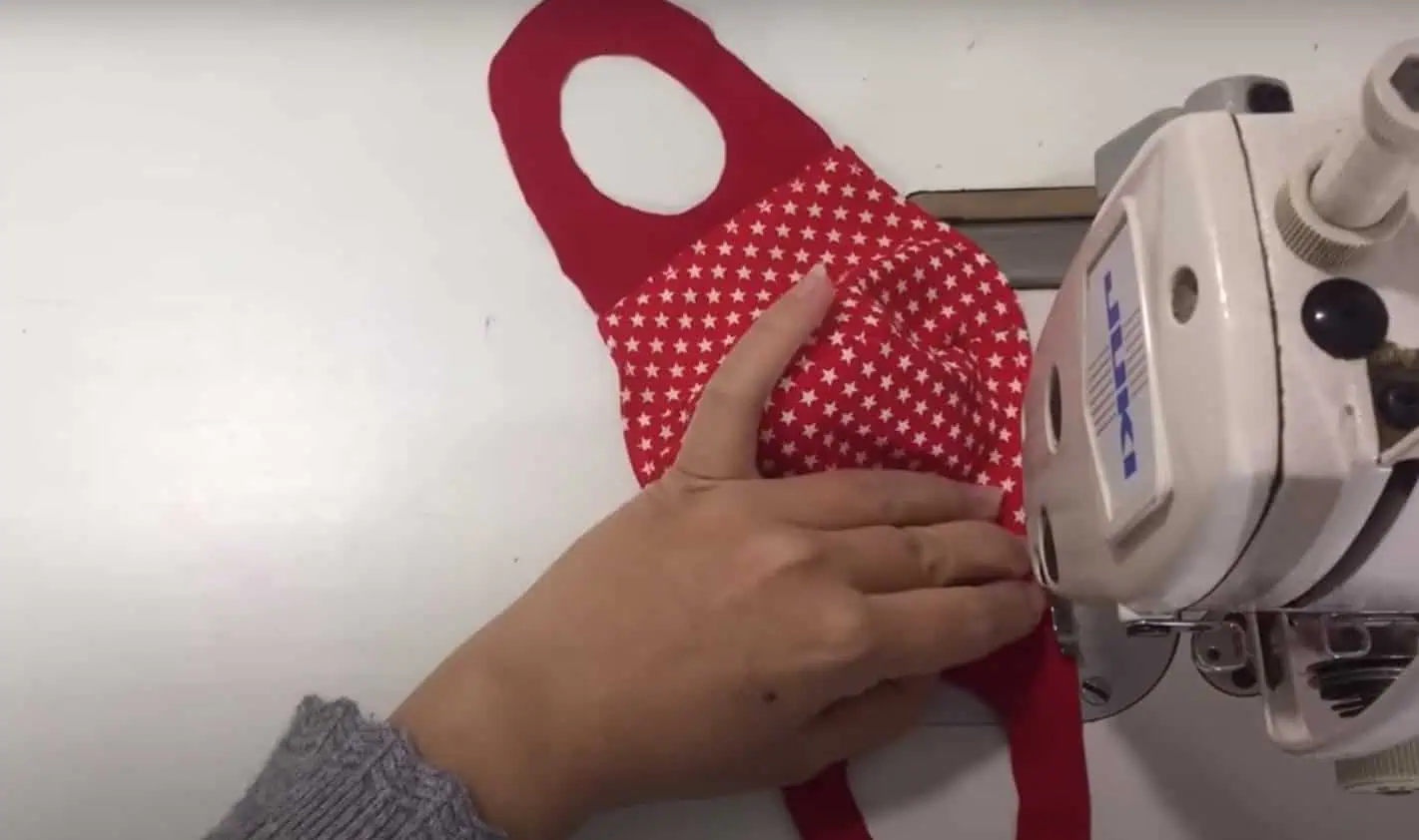 Časť s otvorom na ucho prekreslíme na elastickú látku, ktorú preložíme na polovicu. Potom vystrihneme. Následne si prišijeme k sebe dve a dve časti rúška oblou stranou k sebe.