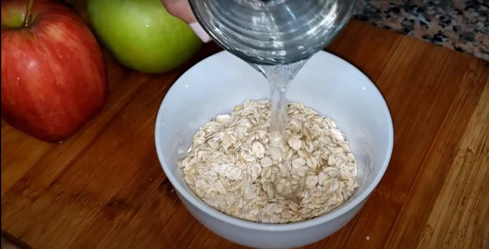 Do misky si nasypte ovsené vločky, zalejte ich vodou a nechajte odpočívať asi 30 minút. Medzitým si umyte a očistite jablko od jadrovníka. Potom ho aj so šupkou nakrájajte na malé kúsky.