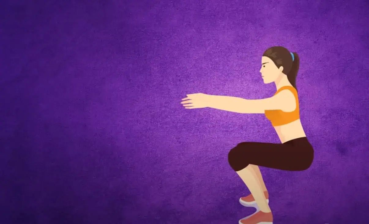 Pozerajte sa pred seba. Váhu preneste na päty a zadok ťahajte dolu, akoby ste si chceli sadnúť na stoličku.