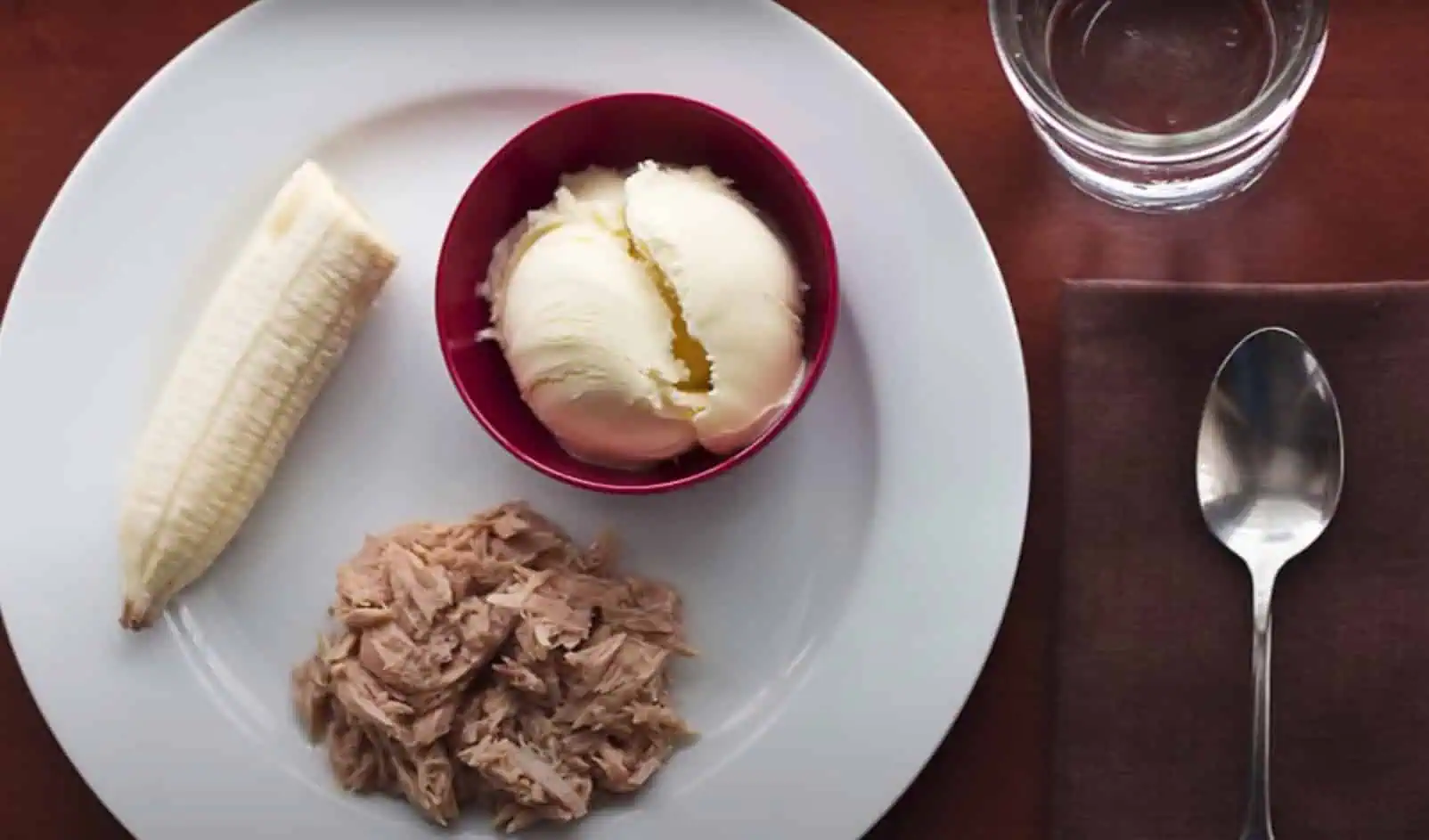 1 konzerva tuniaka, 1/2 banánu a ako dezert 1 kopček vanilkovej zmrzliny