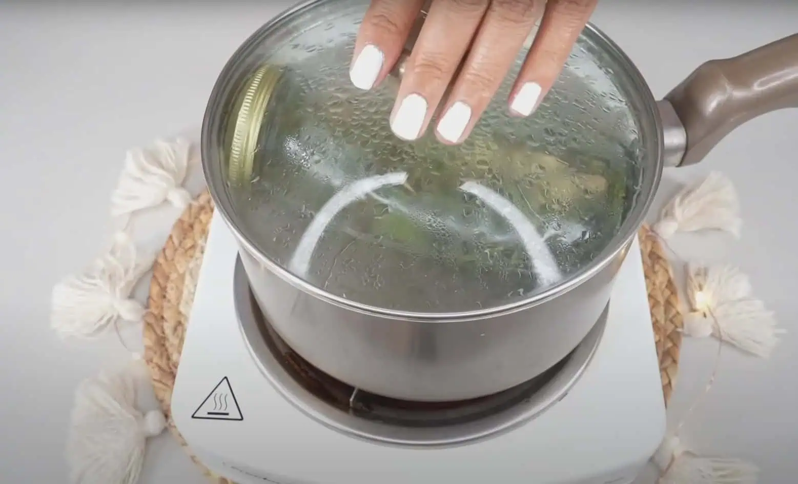 Takto pripravený pohár teraz vložíme do hrnca s horúcou vodou, prikryjeme viečkom a varíme asi 12 – 15 minút.