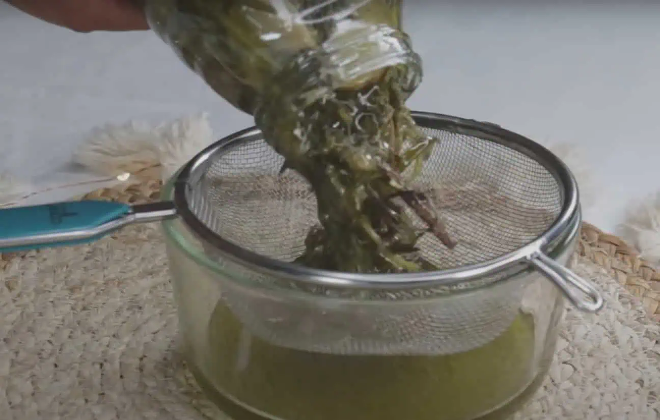 Najskôr ho však ešte precedíme cez sitko a olej dôkladne vytlačíme.