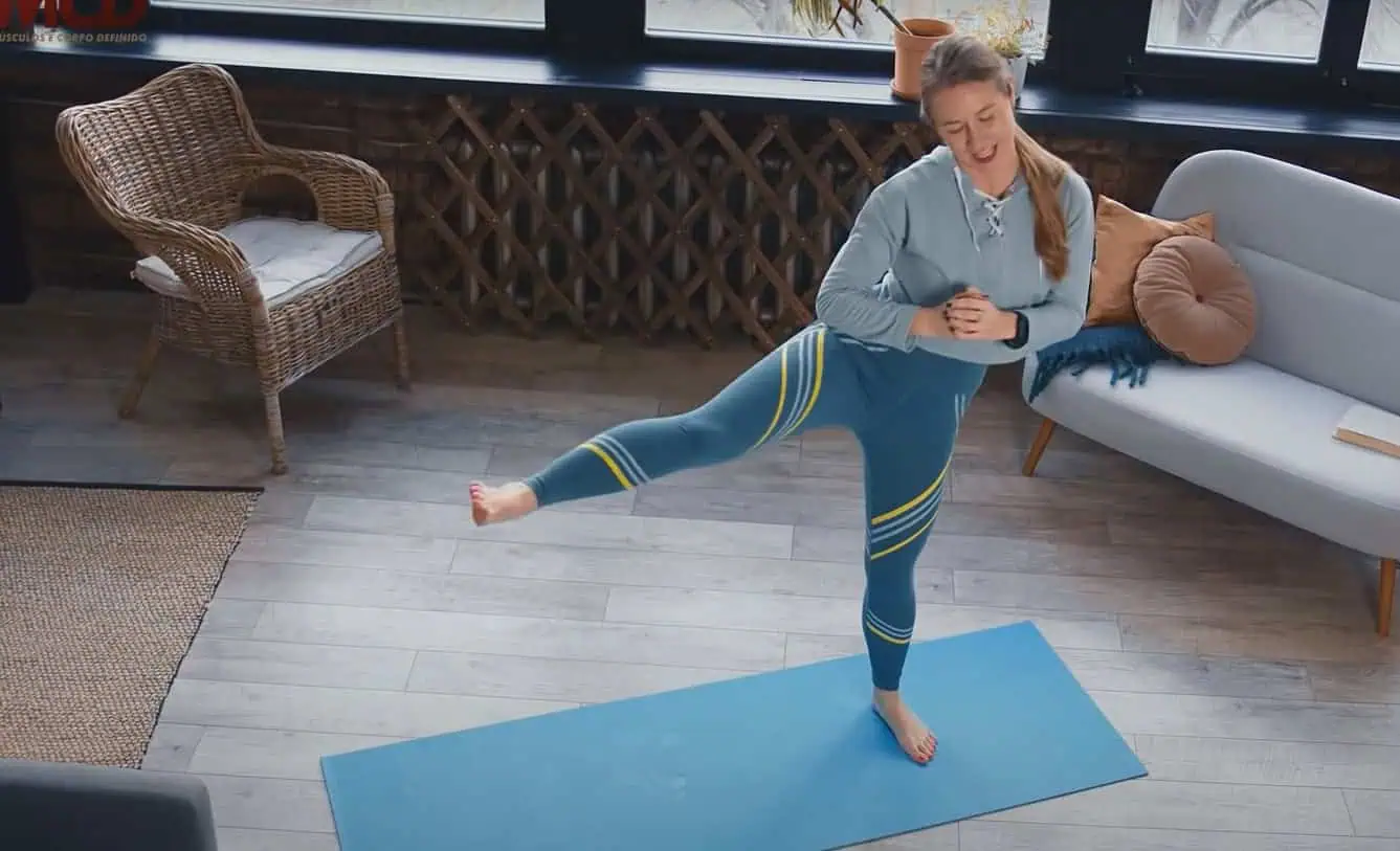 Tento cvik vykonávajte po dobu 30 sekúnd a ideálne je použiť aj fitness gumu, ktorú si umiestnite na boky.