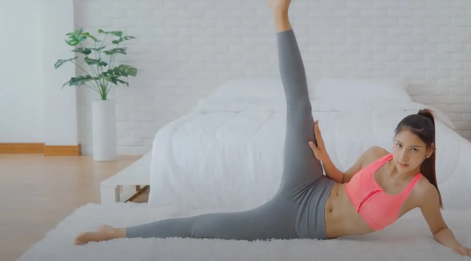 Oprite sa nabok o lakeť a o koleno jednej nohy a zdvíhajte druhú vystretú nohu čo najvyššie, pričom druhá ruka je vbok.