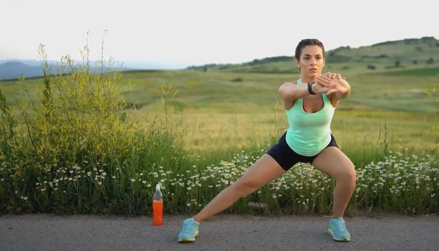 Drep s výkopom vbok je podobný ako klasický drep, ale pri návrate do východiskovej polohy vykopnite jednu nohu do strany.