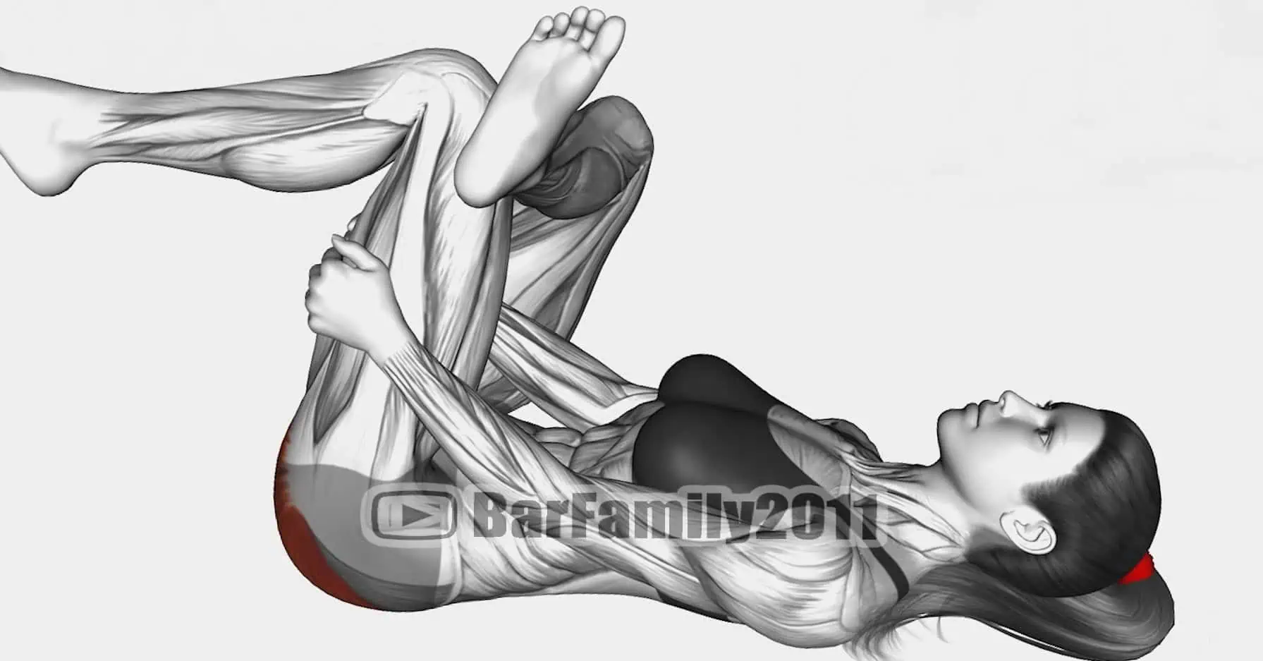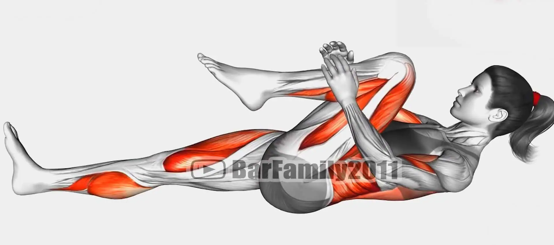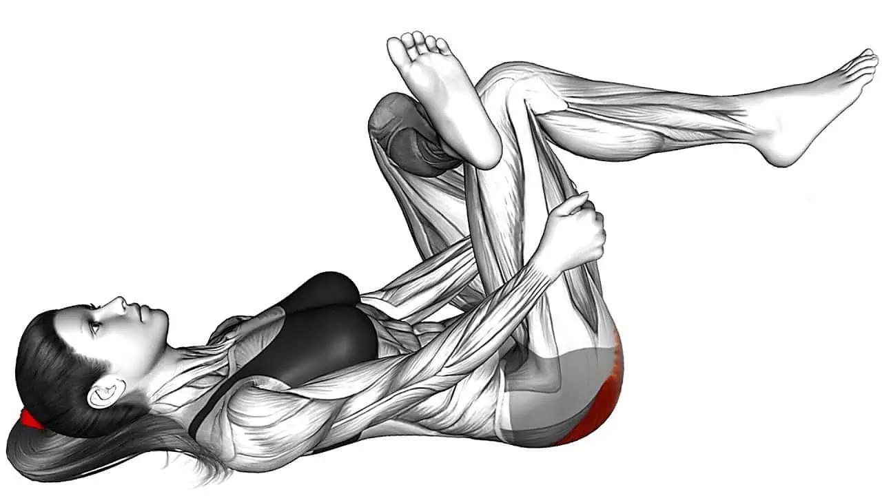 Ľahnite si na podložku, pokrčte jednu nohu v kolene a uchopte ju dlaňami, pričom hlavu súčasne priťahujte ku kolenu.