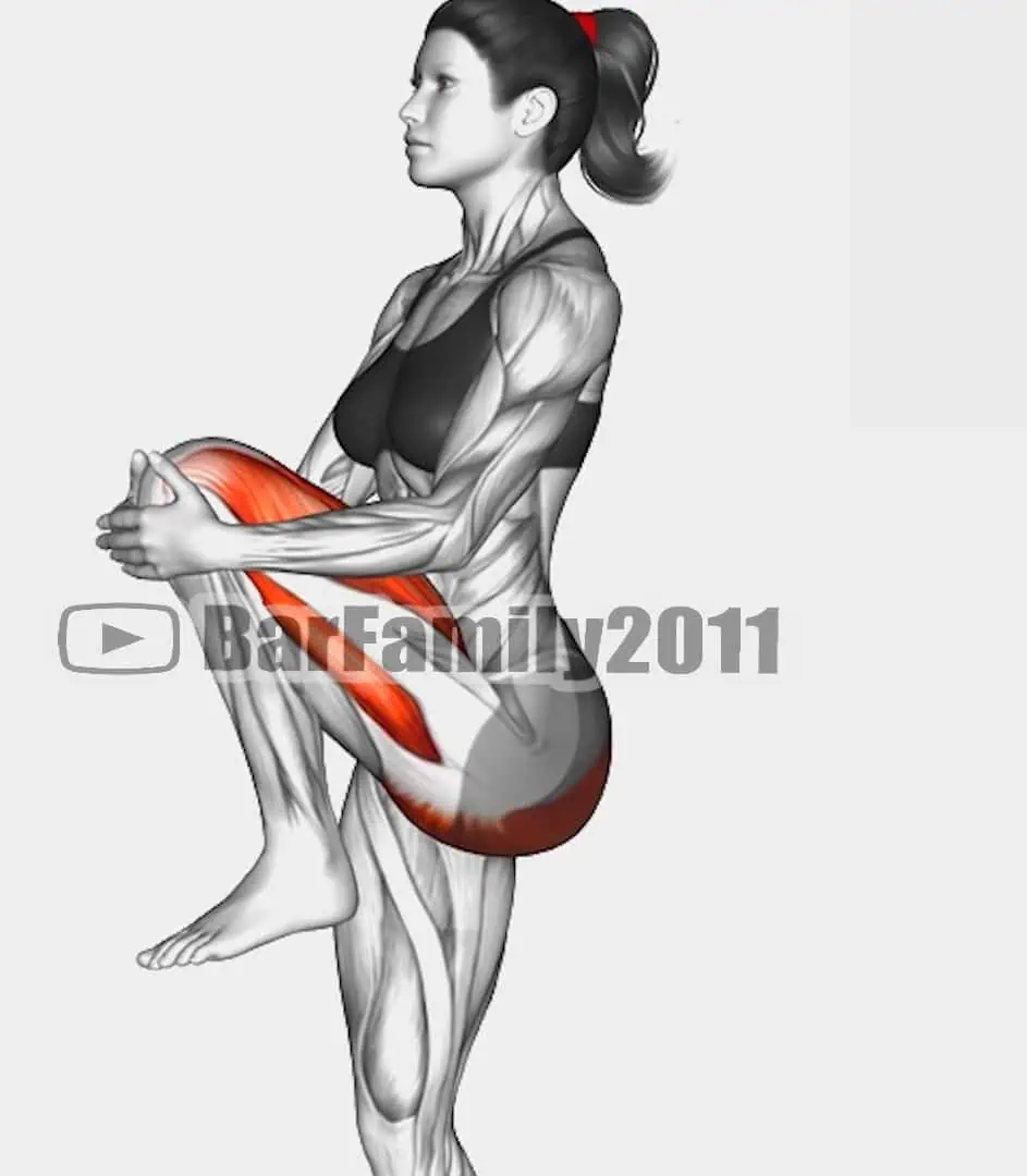 Rukami obopnite zadný stehenný sval a opatrne nohu priťahujte k sebe.