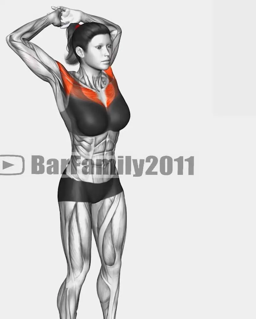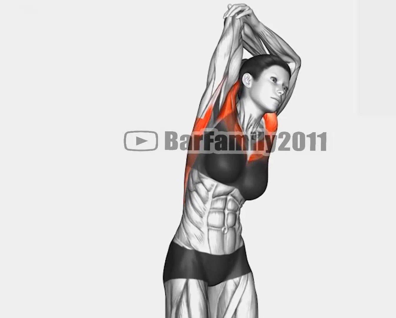 Stojte rovno, ruky zdvihnite nad hlavu a každou dlaňou chyťte lakeť opačnej ruky tak, aby ste mali ruky nad hlavou.