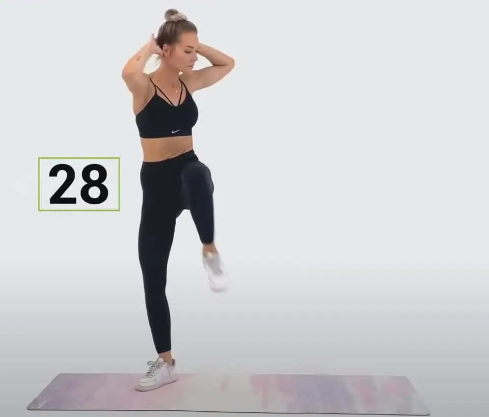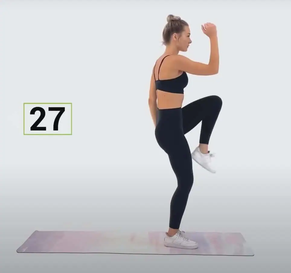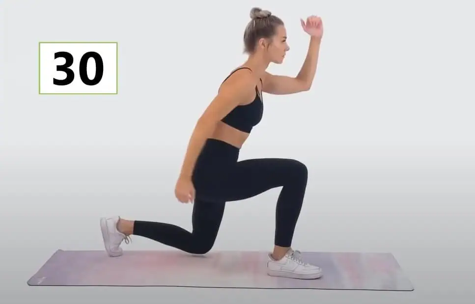 Postavte sa vzpriamene, urobte výpad vzad, pričom kolená držte v priamom uhle a následne koleno ťahajte vpred k opačnému lakťu.