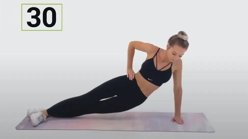 Ľahnite si na bok, vystreté nohy prekrížte, zaprite sa rukou o dlaň a zdvihnite sa zo zeme tak, aby telo bolo v jednej línii.
