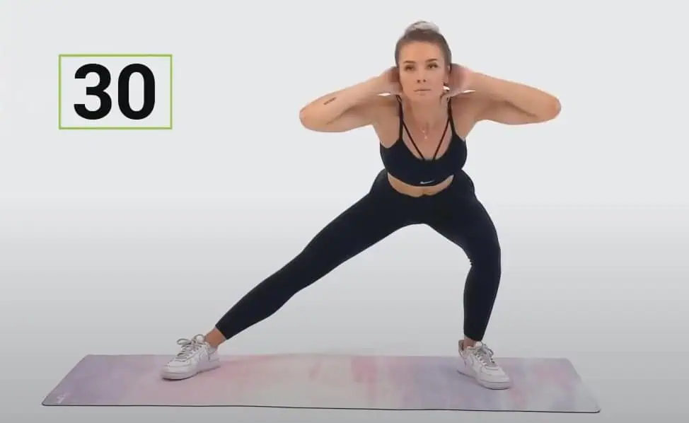 Naširoko sa rozkročte, ruky si dajte za hlavu, preneste váhu do jednej strany, pokrčte koleno tak, aby nepresiahlo cez špičku na chodidle a potom ťahajte koleno k opačnému lakťu.
