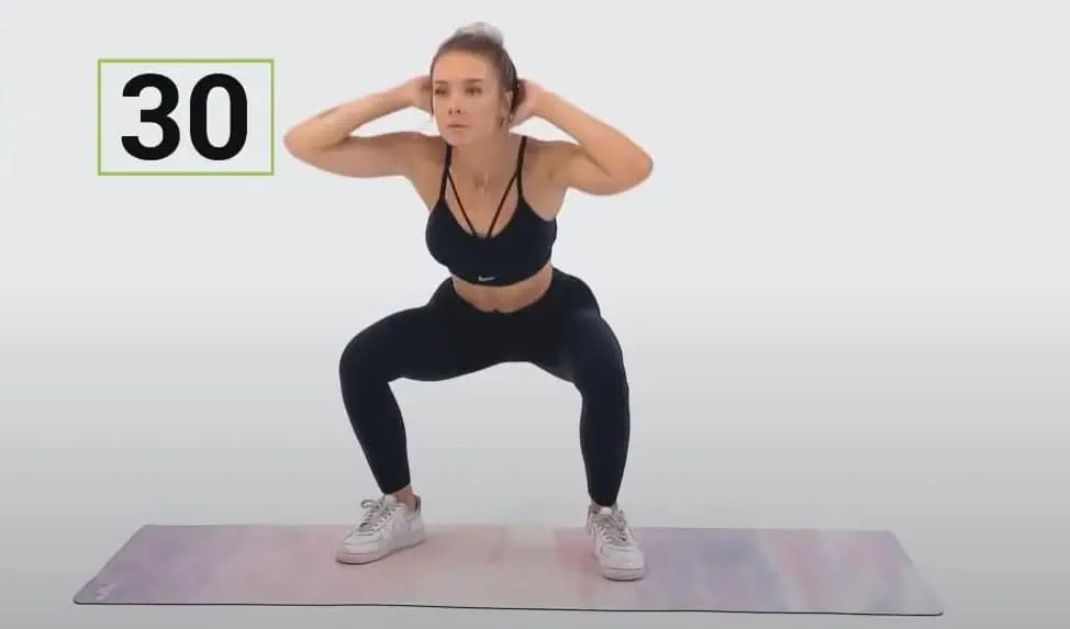 Postavte sa s nohami rozkročenými na šírku bokov, urobte drep a potom striedavo ťahajte jedno a druhé koleno vždy k opačnému lakťu.