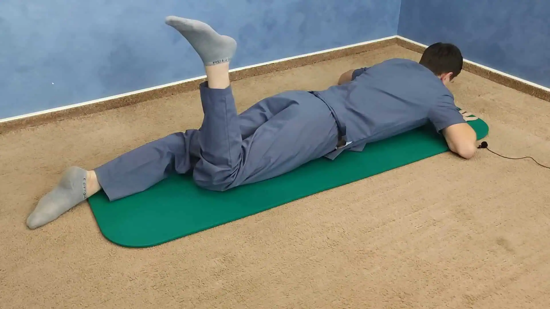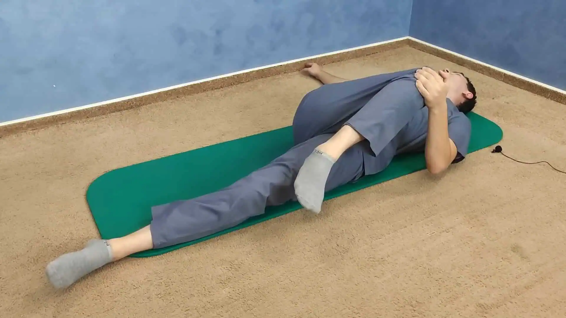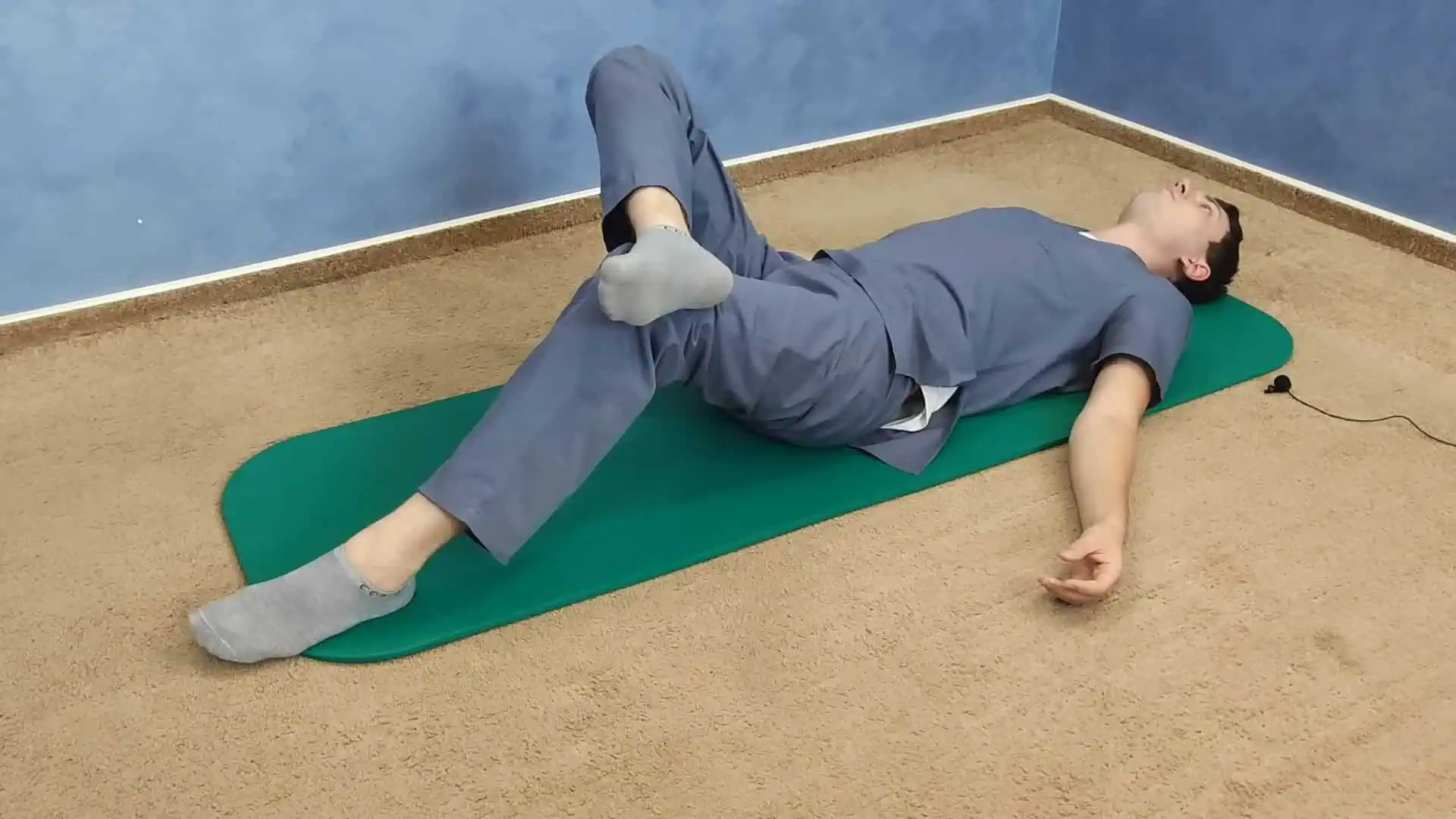 Ľahneme si na podložku, pokrčené nohy položíme na podložku.