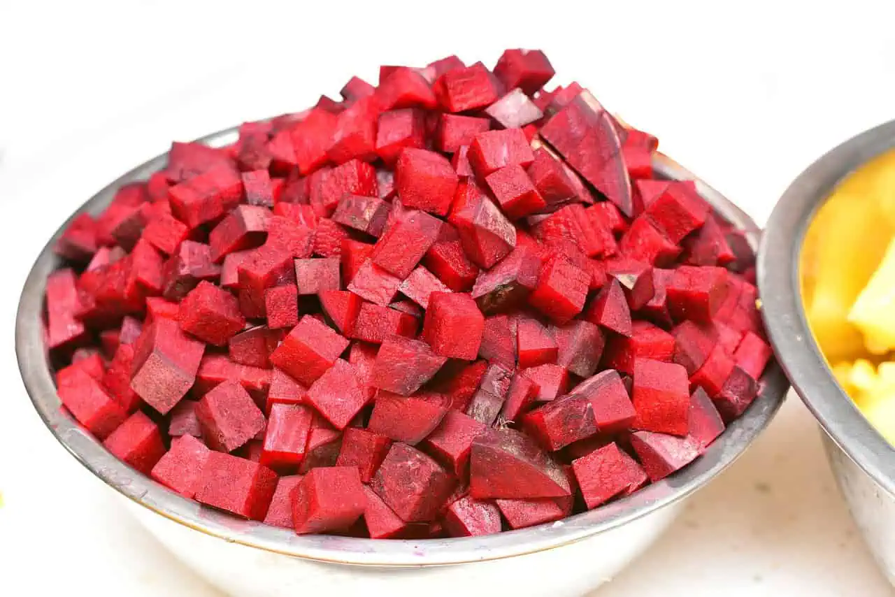 Do nádoby pridáme na kocky nakrájanú cviklu.