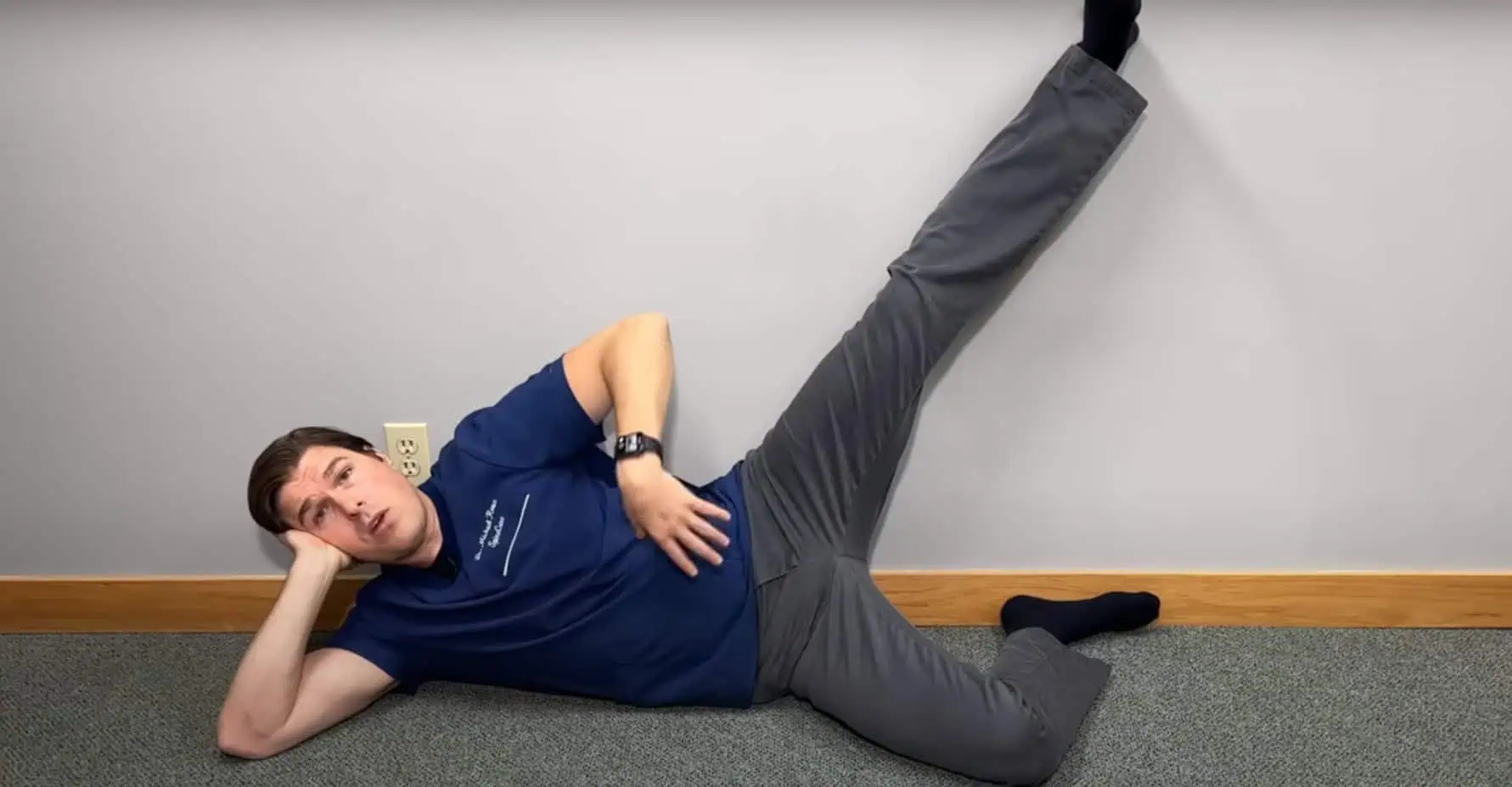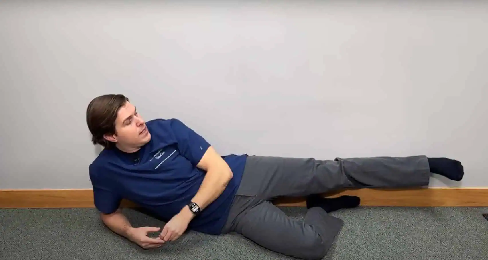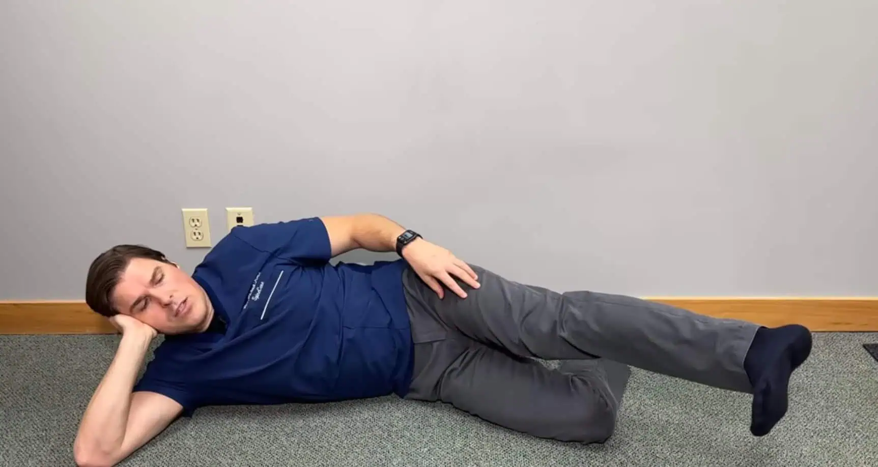 Ľahnite si na zem tak, že spodnú nohu pokrčte v kolene a chodidlom tejto nohy sa zaprite o stenu.