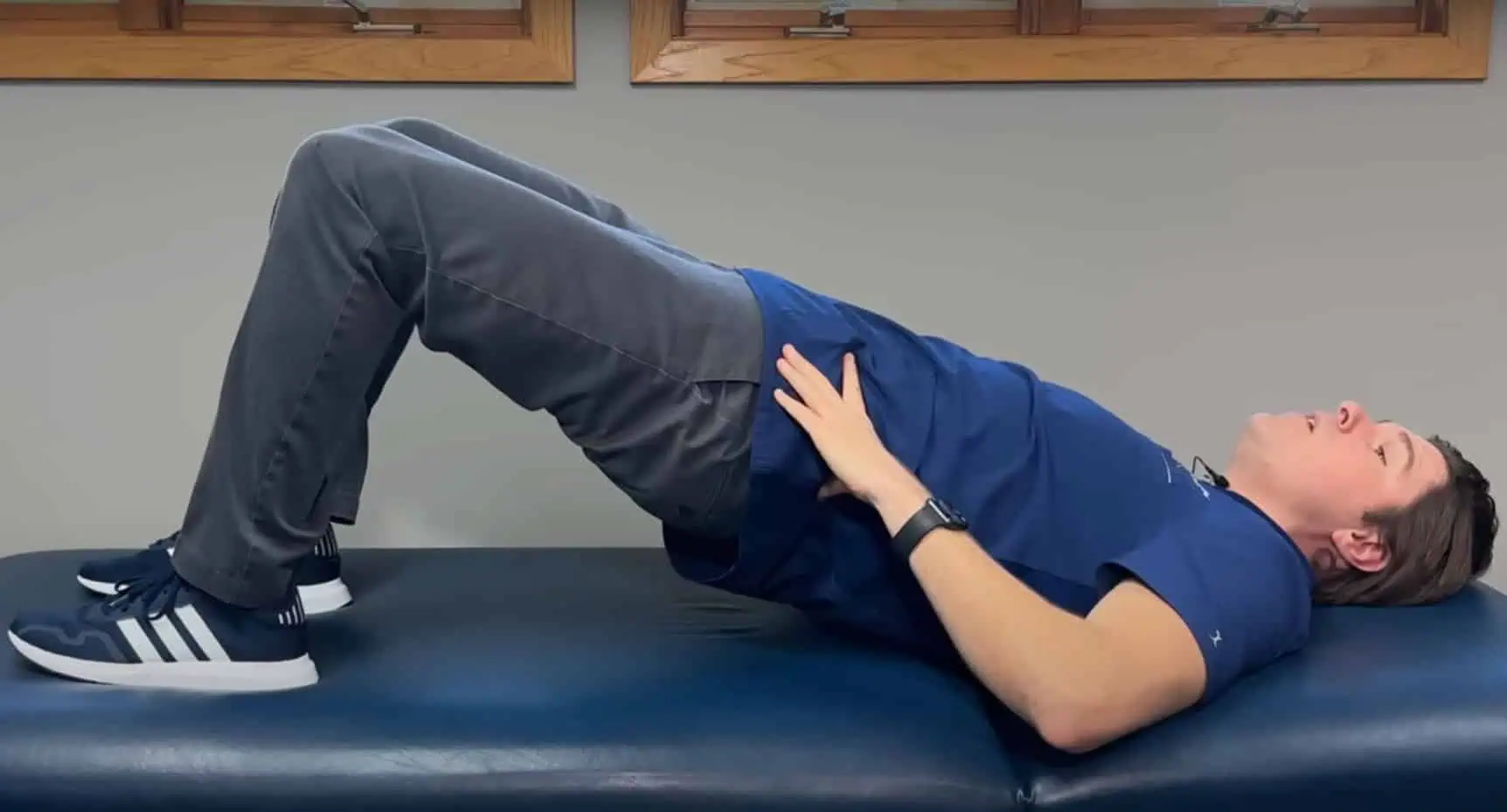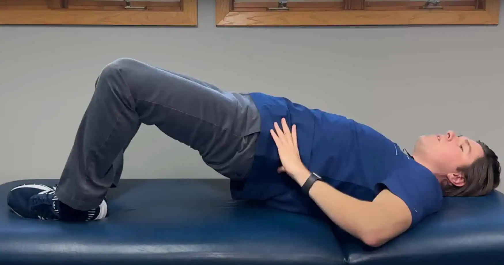 Ľahnite si na chrbát, obe nohy pokrčte a položte chodidlami na podložku.