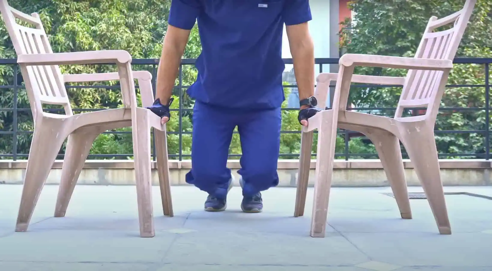 Postavte dve stoličky oproti sebe a o sedadlo sa oprite dlaňami z každej strany.