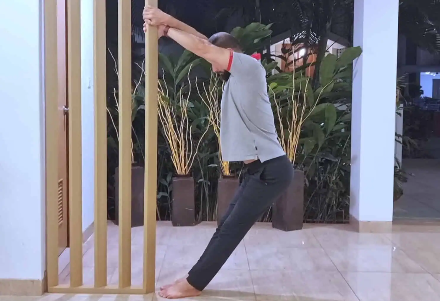 Natiahnite ruky dopredu cez seba krížom a uchopte tyč.