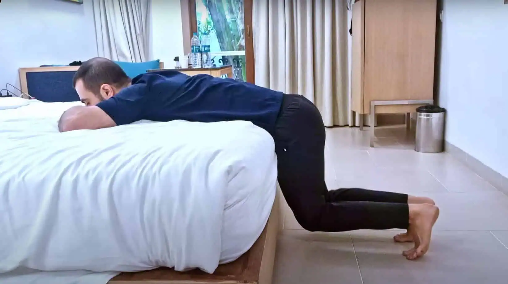 Kľaknite si na zem k posteli a ľahnite si vrchnou časťou trupu na posteľ na brucho.
