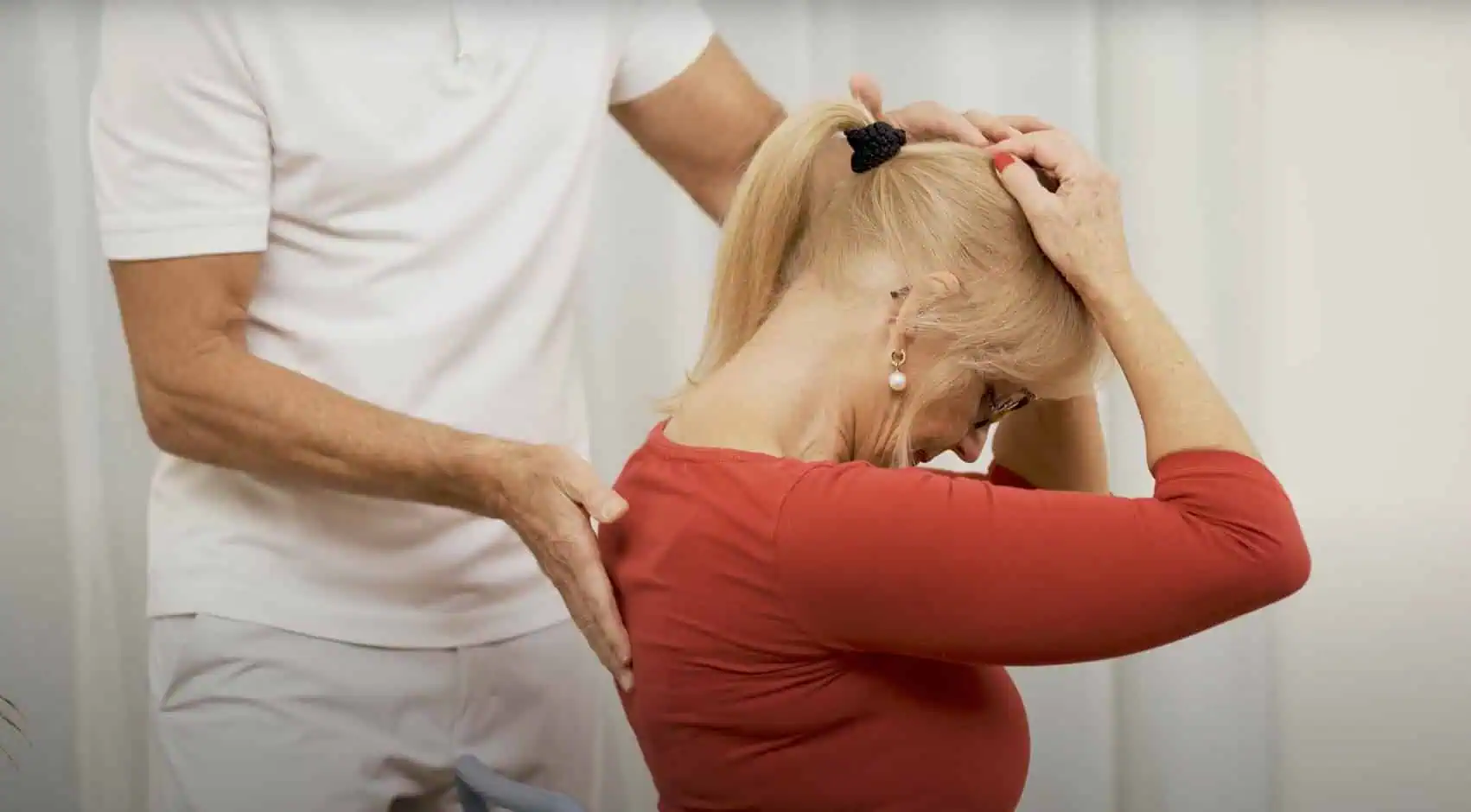 Keď máte dlane na hlave, opatrne potiahnite krk do jemného predklonu.