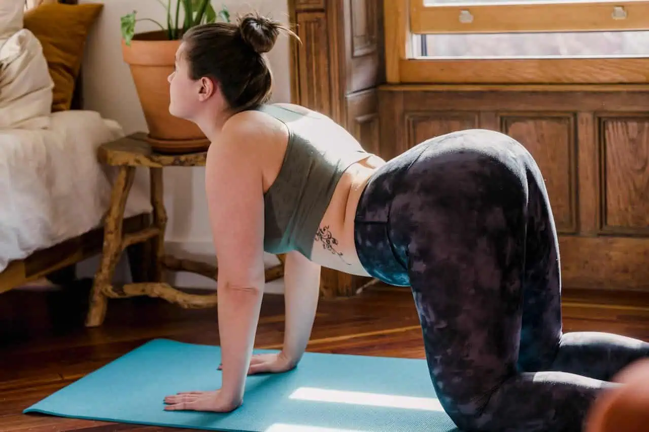 S výdychom vytvorte hrb chrbta, odsuňte lopatky od seba a vtiahnite pupok – pozícia mačky.