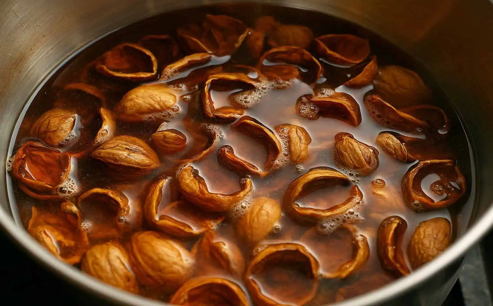 Druhý spôsob je rýchlejší – stačí orechové škrupiny 30 minút variť a potom 15 minút nechať lúhovať.