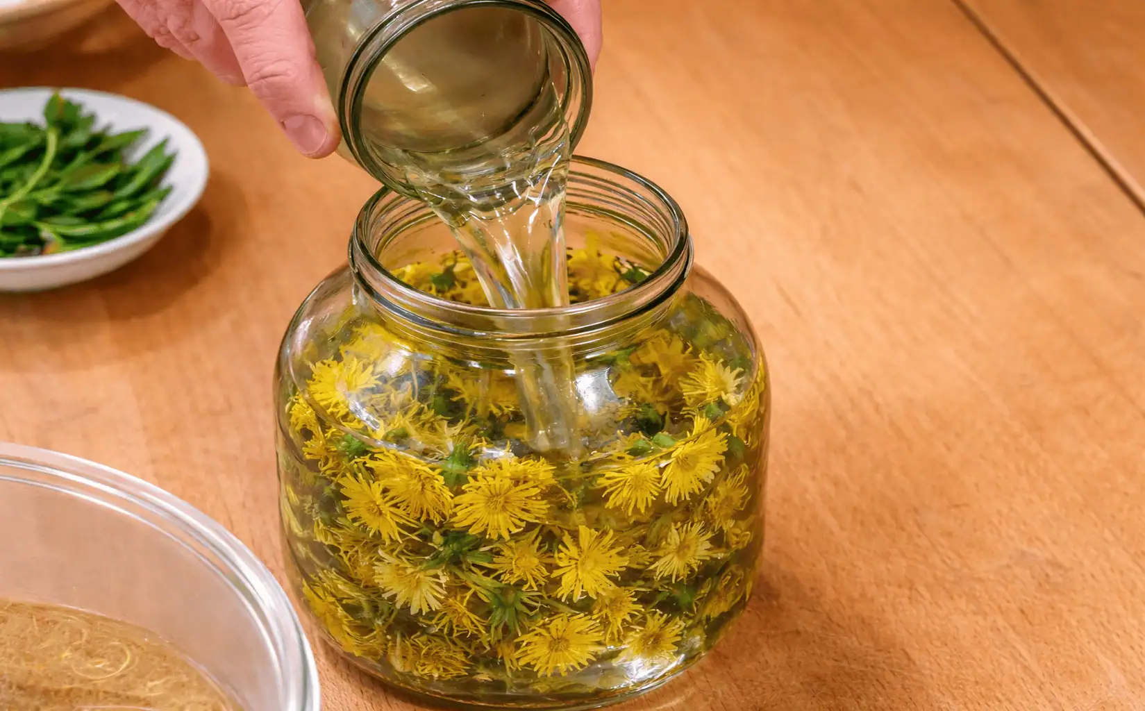 Do hrnca pridajte rastlinný olej a kvety púpavy.