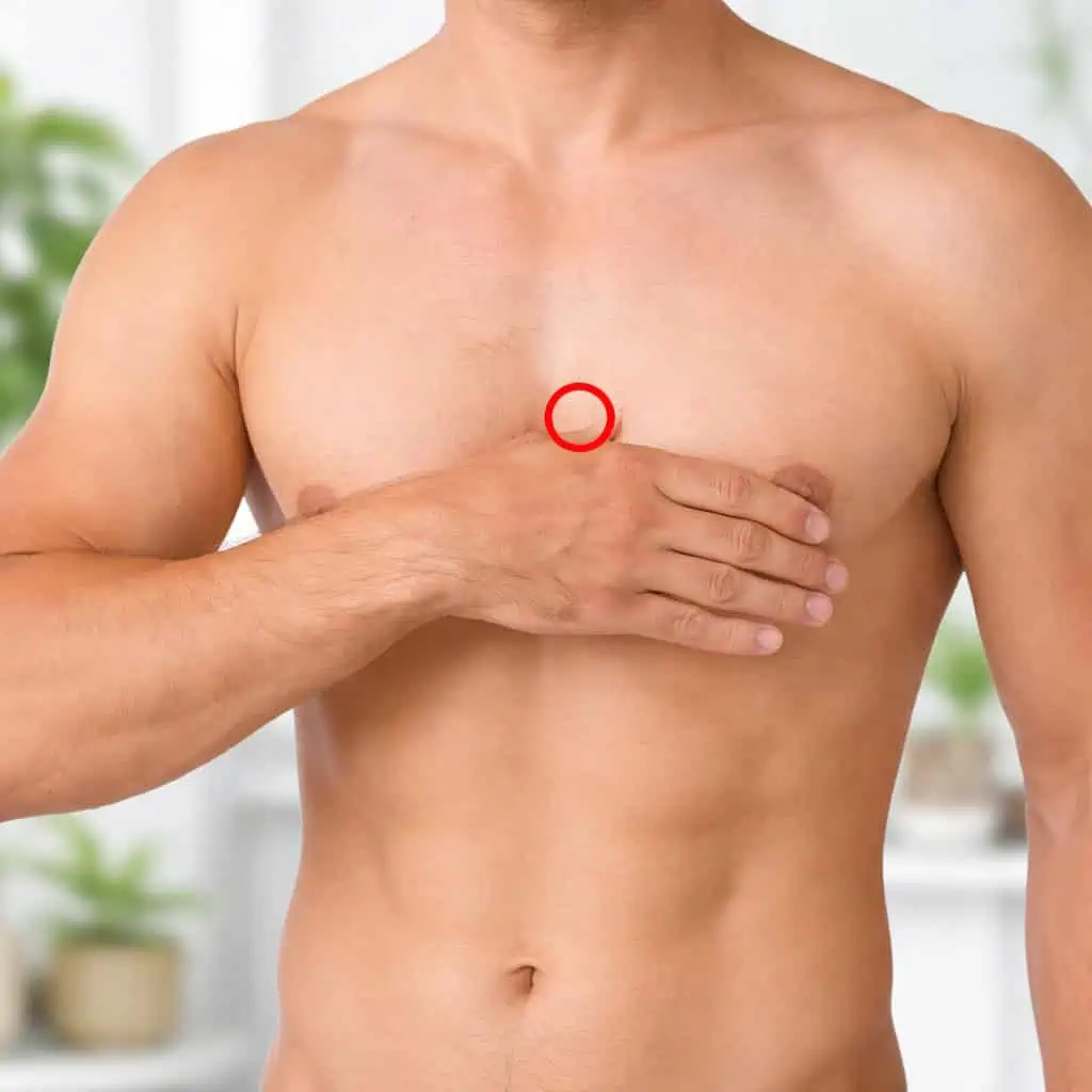 Miesto: Nájdete ho celkom ľahko. Nachádza sa v strede hrudníka, na spodnej časti hrudnej kosti.